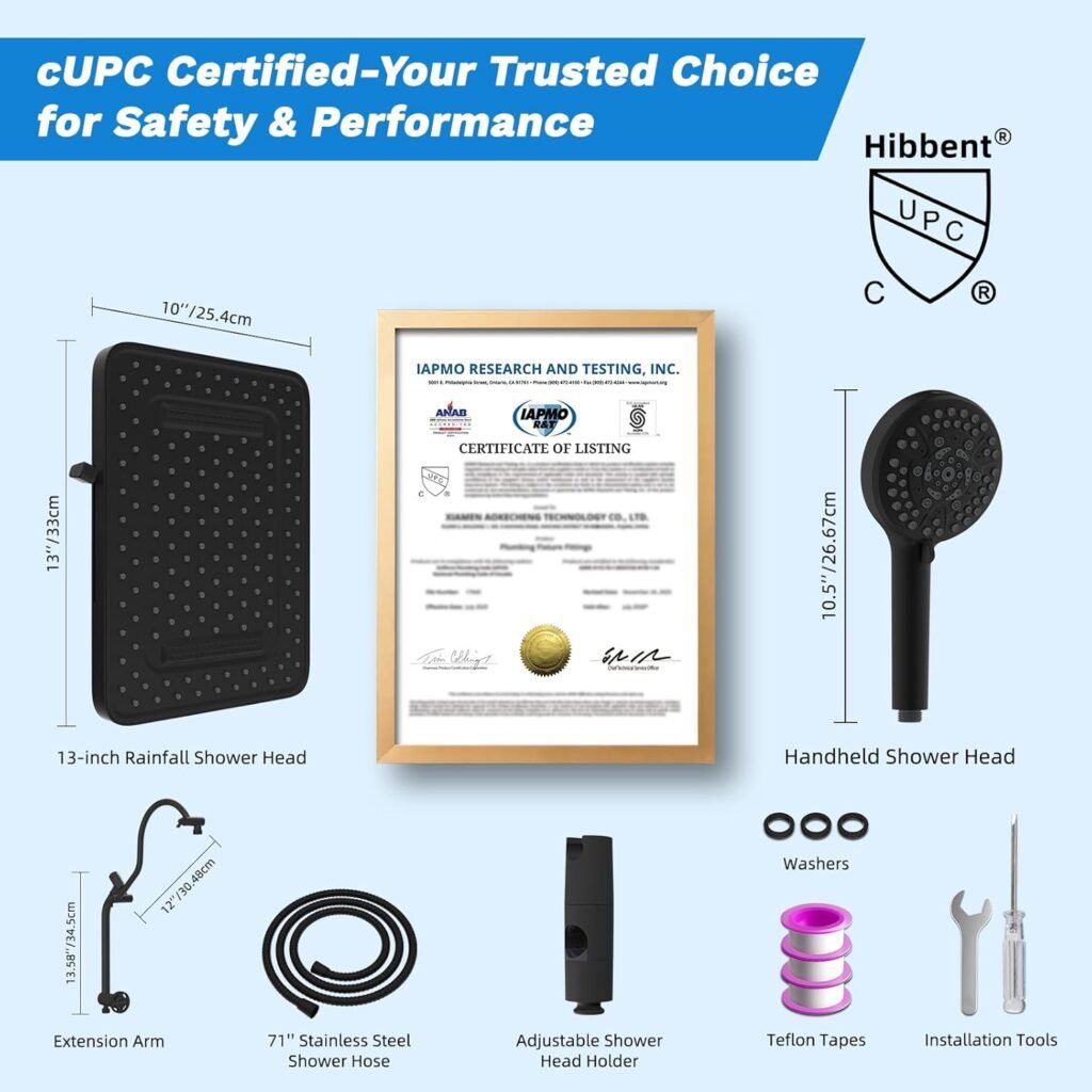 The Hibbent cUPC Certified 13” Shower Head Combo combines luxury design, powerful performance, and practical features in one complete package. With its large rainfall showerhead, versatile handheld sprayer, and durable all-metal construction, it offers a noticeable upgrade over standard shower systems.